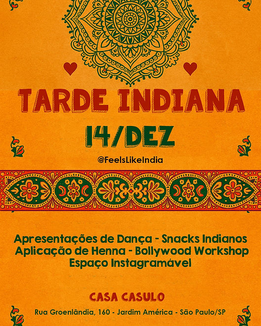 Este ingresso dá direito ao evento Tarde Indiana Feels Like Índia, no dia 14 de Dezembro de 2025. Com Snacks e Bebidas, Apresentações de Dança, Workshop de Dança, Aplicação de Henna + Brindes.
